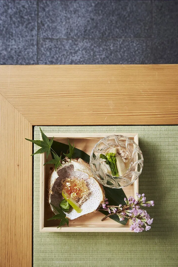 Hokkaido hairy crab with ikura and gold flakes, as well as seabream roe with bamboo shoot.