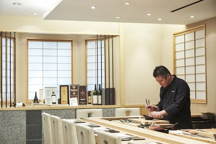 Ki-sho’s chef preparing dishes at the sushi counter.