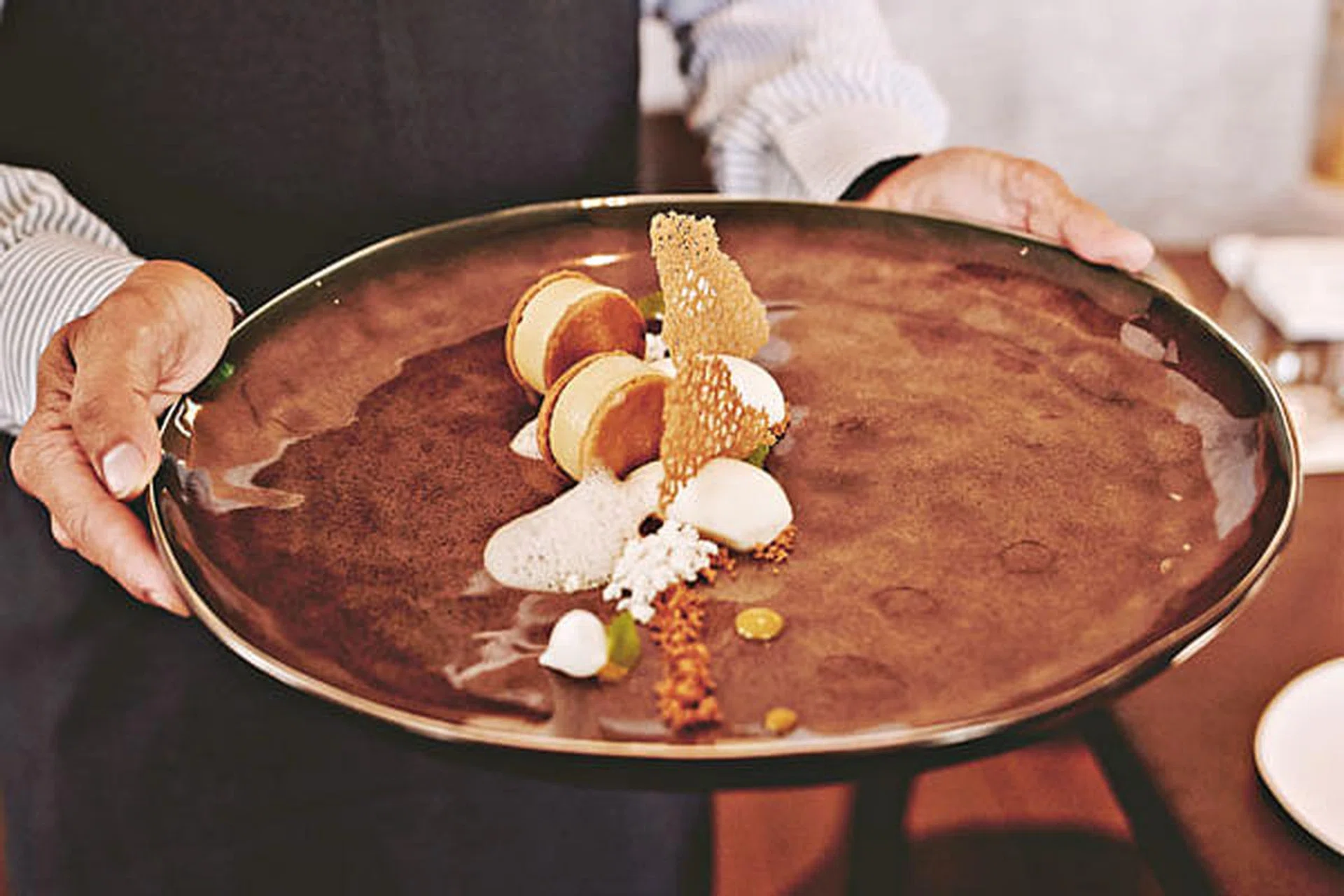 This approach is demonstrated across the menu and is especially distinct in the signature dish of Onion Doux des Cevennes – arguably the restaurant’s magnum opus. The variety from the foothills of south-central France is prized for its soft texture and honeyed flavour. Here, it is executed in a few ways: pureed and served as a tart on a medallion of filo pastry; as a broth with earl grey tea and mixed in a hollowed onion shell with sous vide egg topped with truffle shavings; and as a dehydrated then lightly fried wafer with a bittersweet crunch.