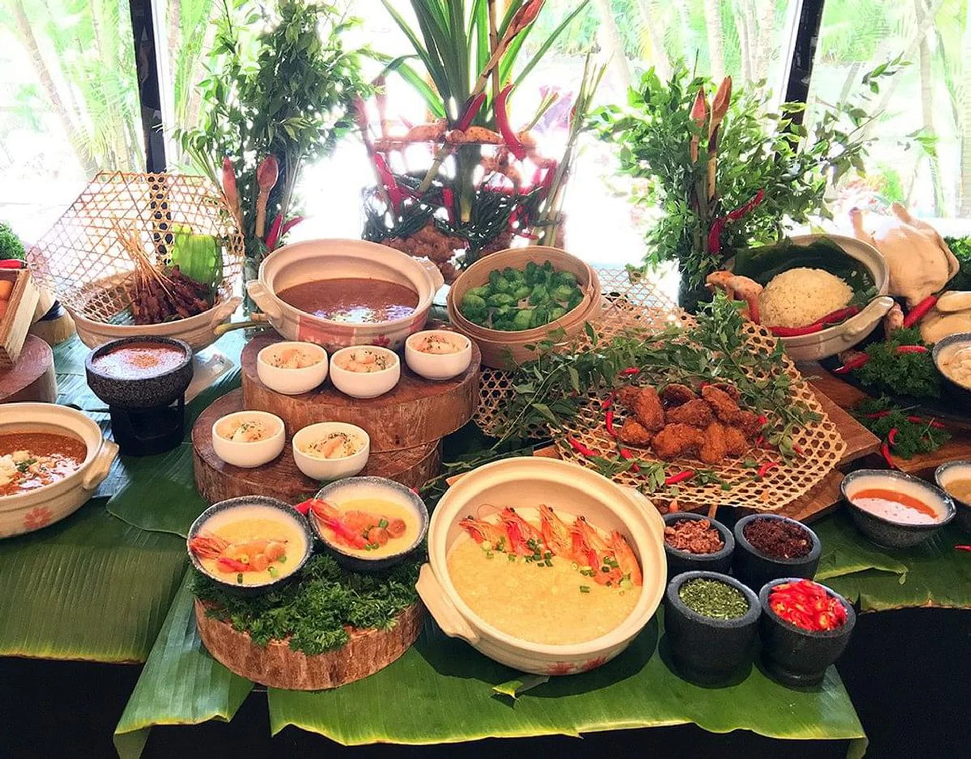 Take it all in slowly, because mains are where the fun begins. There’s a hulking truffle and mushroom beef roast, for instance, that station chefs will happily heap on your plate with roasted baby potatoes and crispy Yorkshire pudding. Asian favourites of chilli crab and fried mantou, chicken rice and satay also jostle for top spot here, though it’s a piquant bowl of king prawn congee turned a sweet golden with dried scallops, pumpkin and goji berries that is the standout.