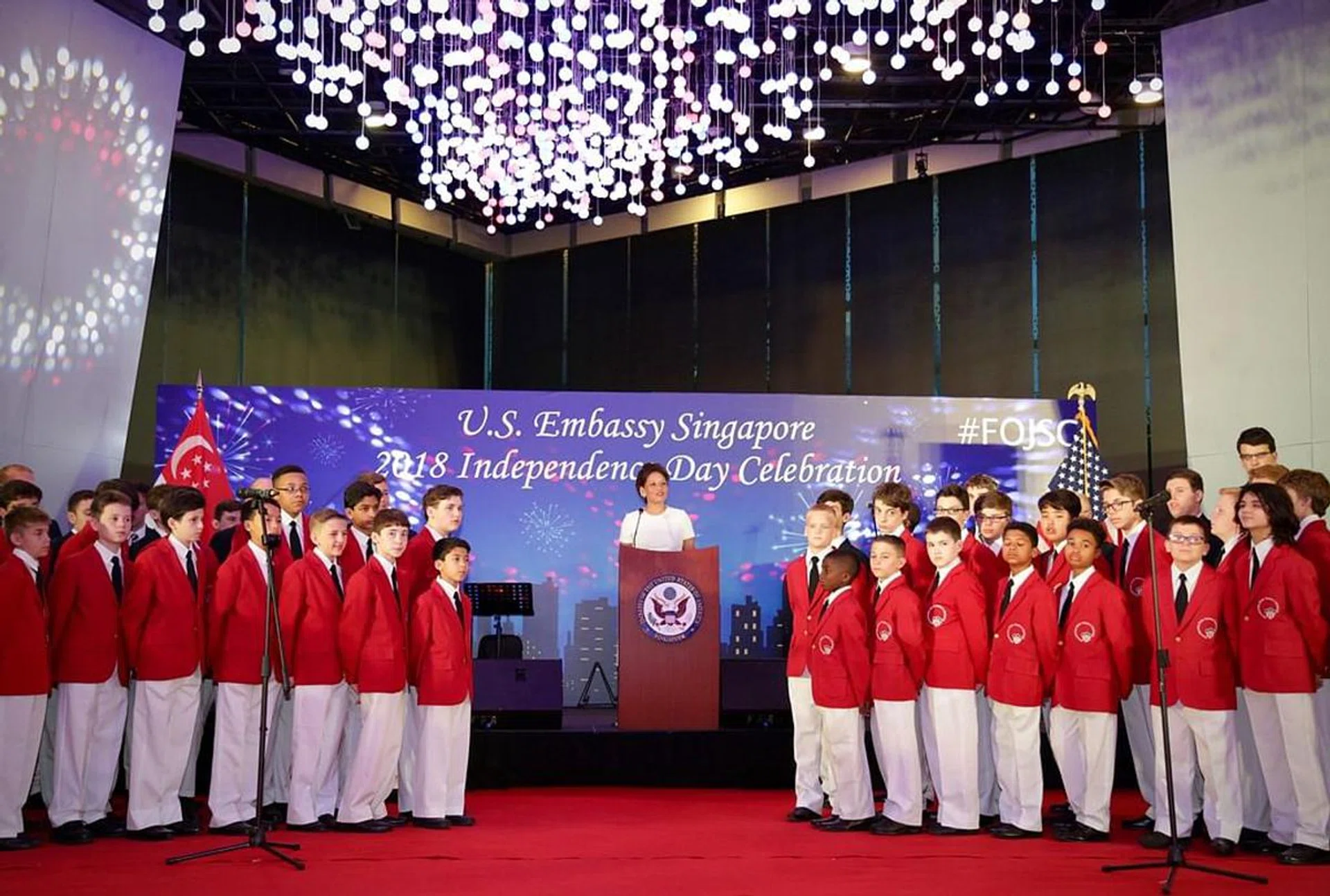 In commemoration of America's 242nd Independence Day, the U.S Embassy in Singapore held a reception at Gardens by the Bay on July 4. The celebration began with the U.S. Marine Corps Colour Guard ceremony, remarks by Chargé d'Affaires ad interim, Ms Stephanie Syptak-Ramnath and Singapore Senior Minister of State for Defence and Foreign Affairs, Dr. Mohamad Maliki Bin Osman. The world-renowned Philadelphia Boys Choir also sang the US and Singapore national anthems. Among the guests present were Ms Jessica Tan, Member of Parliament, and Mr Teo Ser Luck, Member of Parliament.