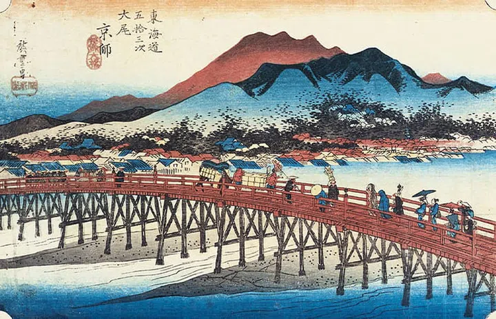 Look out especially for those from Katsushika Hokusai's famed Thirty-Six Views Of Mount Fuji series and Utagawa Hiroshige's The Fifty-three Stations Of The Tokaido series. The skill of the carver is especially impressive in a print collaboration by Utagawa Kuniyoshi and Utagawa Torijo titled Wanting To Eat: Mimasaka Province, in which individual rice grains can be seen in the rice dumplings carried on a tray.