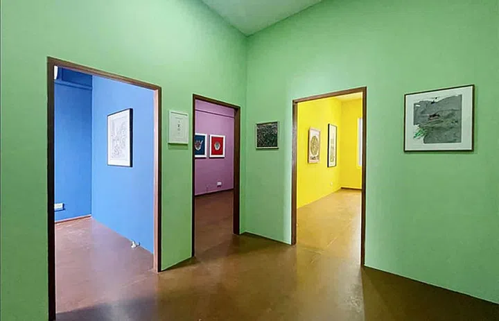 Located on the second floor of the shophouse unit occupied by Art Agenda S.E.A., 63 Upper has a roomy hall in the front and a series of smaller rooms in the rear of the shophouse, painted in unusually bright shades of lemon yellow, baby blue, rosy pink and lavender purple.