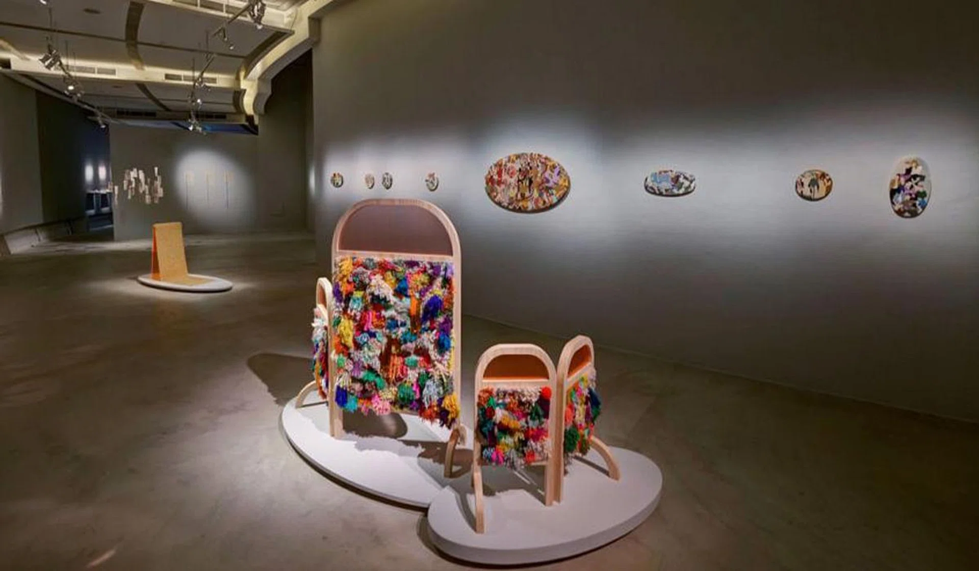 Lim's latch-hooked works, Shankar's freewheeling threadscapes on reclaimed fabrics and Jodi Tan's cross-stitched abstractions treat material and thread as expressive tools for art-making, re-purposing domestic tools in new ways.
