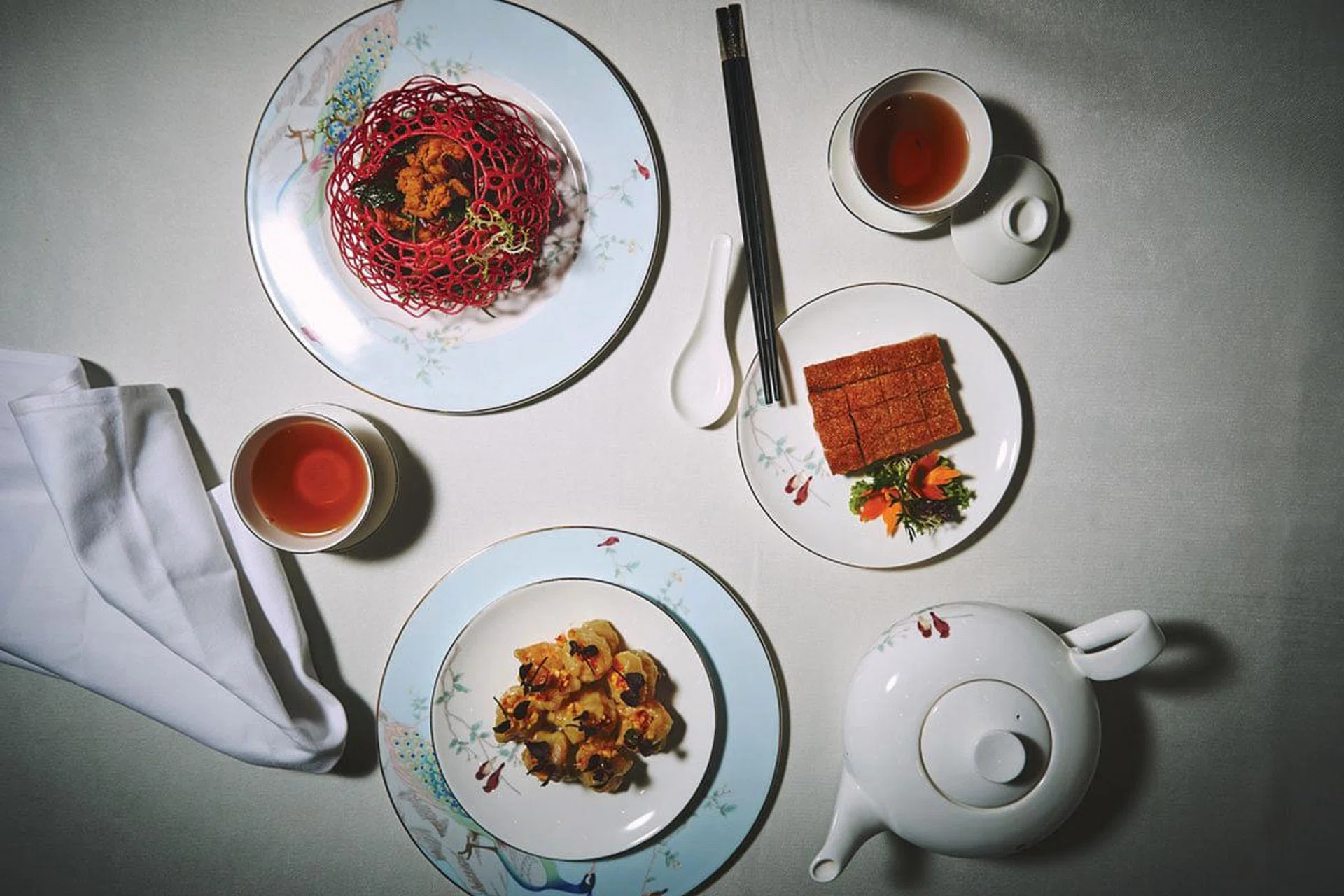 This delicate showcase serves as a visual welcome to the dining table, according to chef Leong. At the table, diners are first acquainted with the charger plate, decked in the same robin egg-blue colours of Jade’s wallpaper. The peacock, roosting on the edge of the plate, is a creative take on the traditional phoenix, which represents prosperity and good fortune. A smaller appetiser plate, featuring two smaller birds, sits on top of the charger and completes the set.