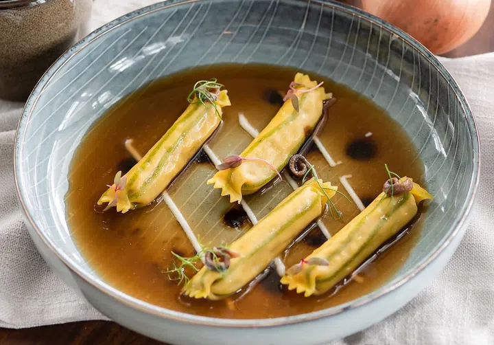 Executive chef Andrea De Paola took inspiration from Pasta alla Genovese, made with a sauce of slow-cooked beef and onion, which was one of his favourite dishes since young. Here, he reshapes the hearty dish into his special rendition of ravioli and adds anchovies (a secret ingredient in his mother’s original recipe) for more depth of flavour.