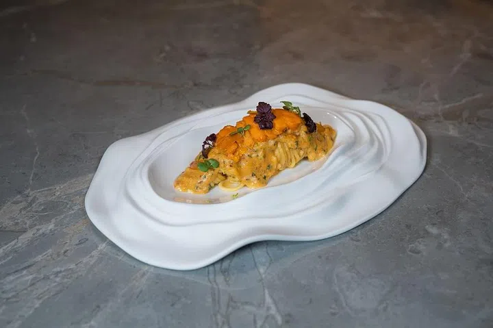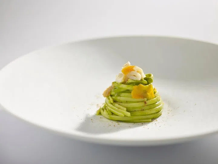 This one-Michelin-starred restaurant at 29 Scotts Road offers a variety of contemporary pasta specialities. Resident chef Denis Lucchi’s creations include seasonal items such as linguine with bamboo clams, sea asparagus and bottarga. The linguine comes from Rustichella d'Abruzzo, a multi-generational family business in Abruzzo, known for their artisanal pasta prepared using traditional methods. The chef tosses the ribbons of pasta with the juice from cooked Scottish bamboo clams and a briny sea asparagus puree, then complements the dish with tender bamboo clam meat marinated in extra virgin olive oil, lemon juice, parsley and bottarga. The dish is finally crowned with sea asparagus and more bottarga shavings.