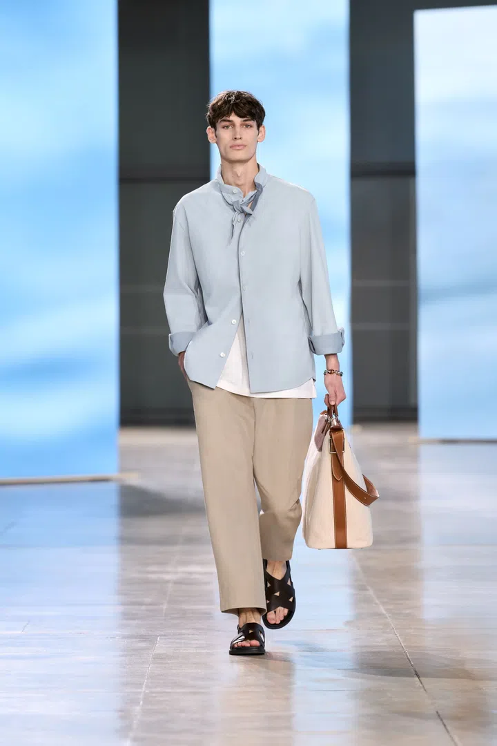 Models on the Hermes runway wore collarless shirts with matching scarves tied neatly and incorporated into collar seams — smart! And the ingenuity did not just stop there. These resort-inspired shirts, which mostly appeared to mimic a breezy drape of quality cotton, thanks partly to the summery pairings of roomy trousers and sandals, turned out to be — we kid you not — calfskin.