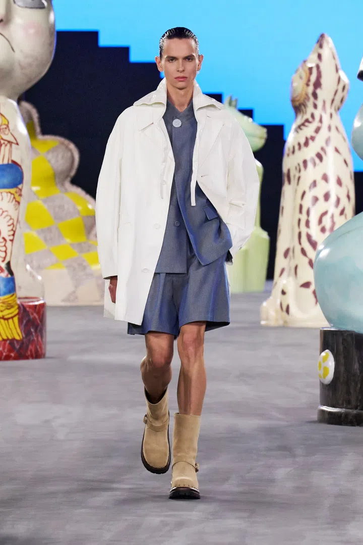 Artistic director Kim Jones credits this influence to the language of ceramics, namely the works of South African ceramist Hylton Nel. Combining the pottery reference with considerations from the Dior womenswear archives, Jones has deconstructed feminine silhouettes just to piece them back together as menswear. Skorts are the new dress shorts, perhaps?
