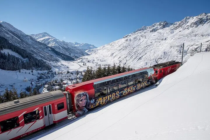 For a tipple-happy end to the skiing session, I hop on the Après-Ski Train, which runs from Andermatt to Disentis and back. Aperitifs such as an Aperol Spritz, champagne and mulled wine are much-welcomed sights, coupled with a cheerful bartender. Amid the convivial chatter, I take in the magical views of frozen lakes and snow-lined valleys from the cabin’s rooftop windows as the train meanders through the snowy tracks.