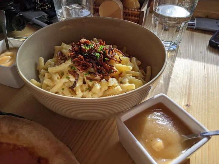 After a strenuous morning of skiing, I tuck into a hearty meal at Alp-Hittä, which serves dishes such as Gotthard macaroni tossed in melted mountain cheese and roasted onion, and served with apple sauce, and rostiflade (rosti pizza), a pizza version of fried potato cake that glistens with smoked bacon, caramelised onions and tomatoes.