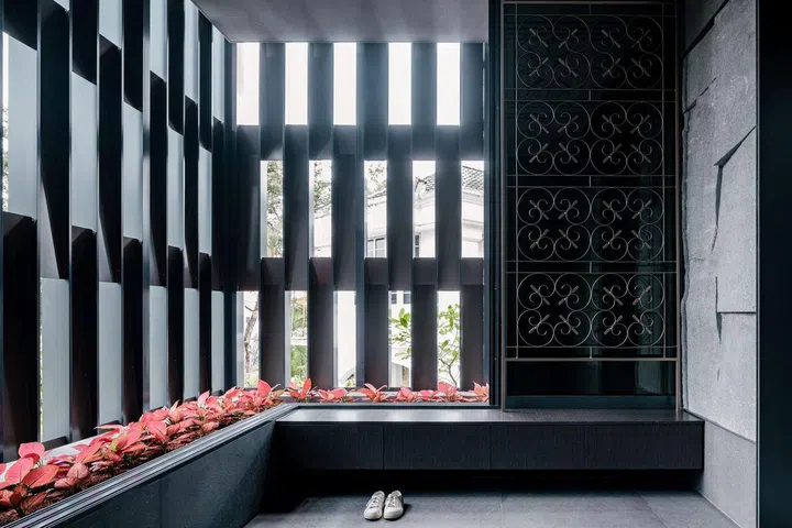 When visitors step into the house, they enter a foyer - a largely empty space, save for a set of wall-mounted grilles. These are no ordinary grilles, but are the ones found in the old house. "They were rusty, but we managed to salvage and restore them," says Lim.