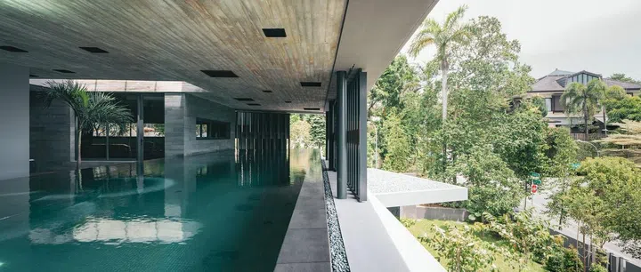 An infinity, semi-outdoor pool on the second floor is something quite unexpected, but Lim has good reason for placing it here. Due to the terrain, there's not much space for greenery on the first floor. "Instead of sharing garden space with the pool, we decided to put the pool on the second floor," says Lim.