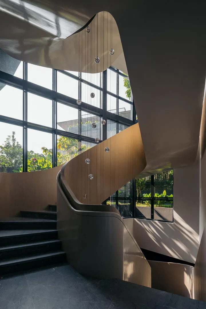 Connecting the basement, where there is a guest room and gym, to all the floors in the house, is an organically shaped staircase. "The curves provide a contrast to the overall angular architecture of the home," says Lim.