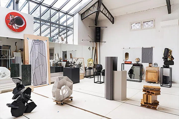 On one side of the studio is Ouvrier’s enchanted forests in the form of screens and wall panels, each painstakingly carved, engraved and hand-painted, while Levy occupies the other half with his sketches, abstract acrylic paintings and experiments that gradually transform into sculptures that are brought to life in foundries and ateliers in Bulgaria, the Czech Republic, Germany, France, and Italy.