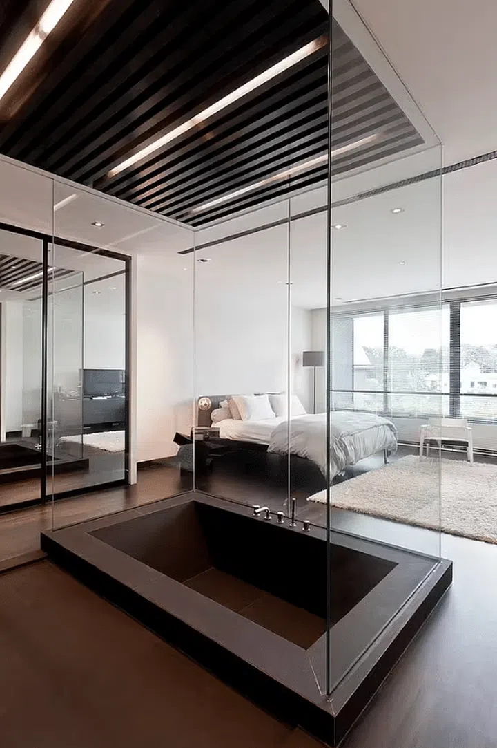 Architology created a home with a timeless contemporary look filled with plenty of cool art and a daring open bath.