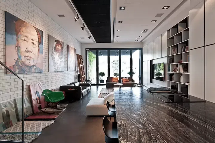 The open-plan layout, coupled with a simple colour theme and subtle lighting contributes to the endearing nature of this home. The straight-forward design allows the artworks to take centre stage, while keeping the interiors looking elegant and inviting.