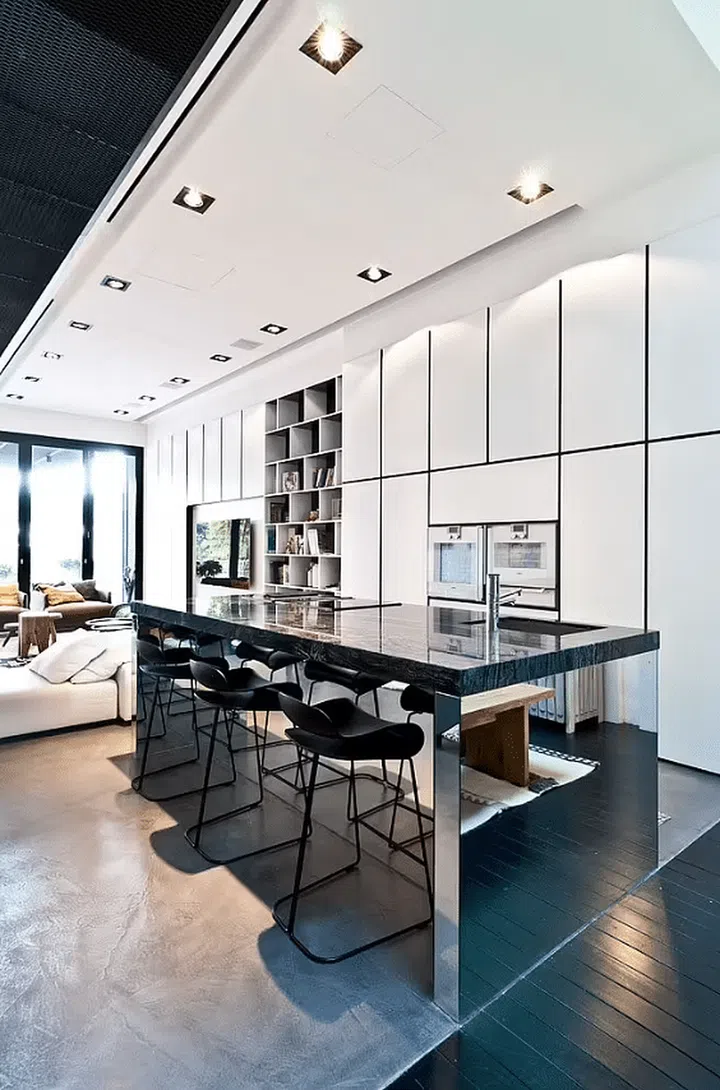 The design team proposed a series of concealed cabinetry without handles to add to the clean and uncluttered look. Most of the panels and walls are in white, accented by the dark-coloured furnishing and accessories.