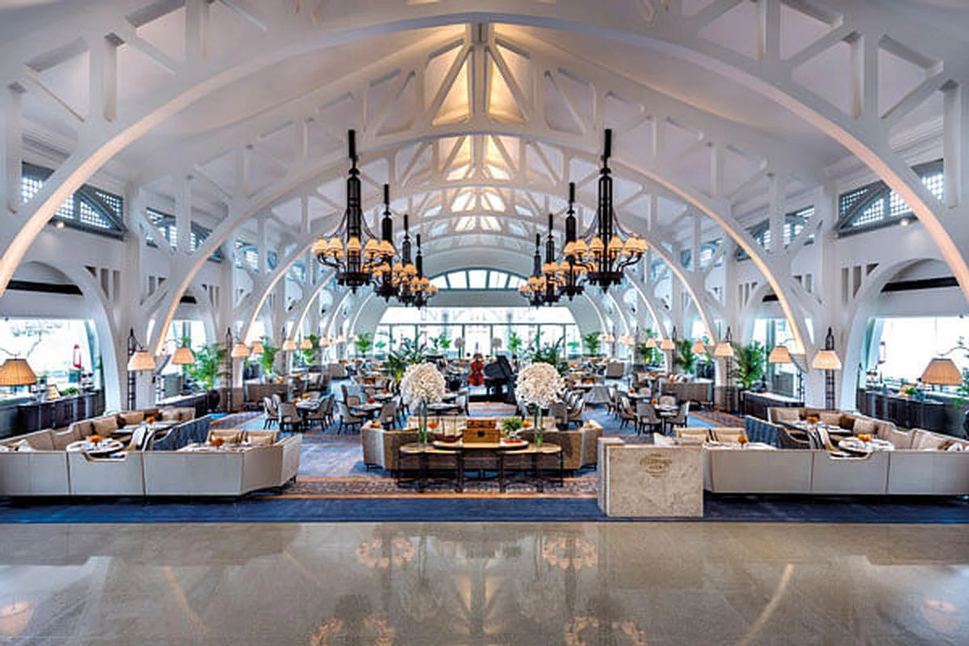During the day, natural light floods the expansive eatery. At night, grand Edwardian lighting casts a warm glow on its pristine white space and wide arches. Red lamp posts at the terrace recall the historical andmark’s other name, Red Lamp Pier, for the navigational aids that hung at the end of the pier. Furnished with custom-made plush couches and flanked by potted palm trees, the restaurant is redolent of the colonial era of elegance similar to that enveloping Raffles Hotel.