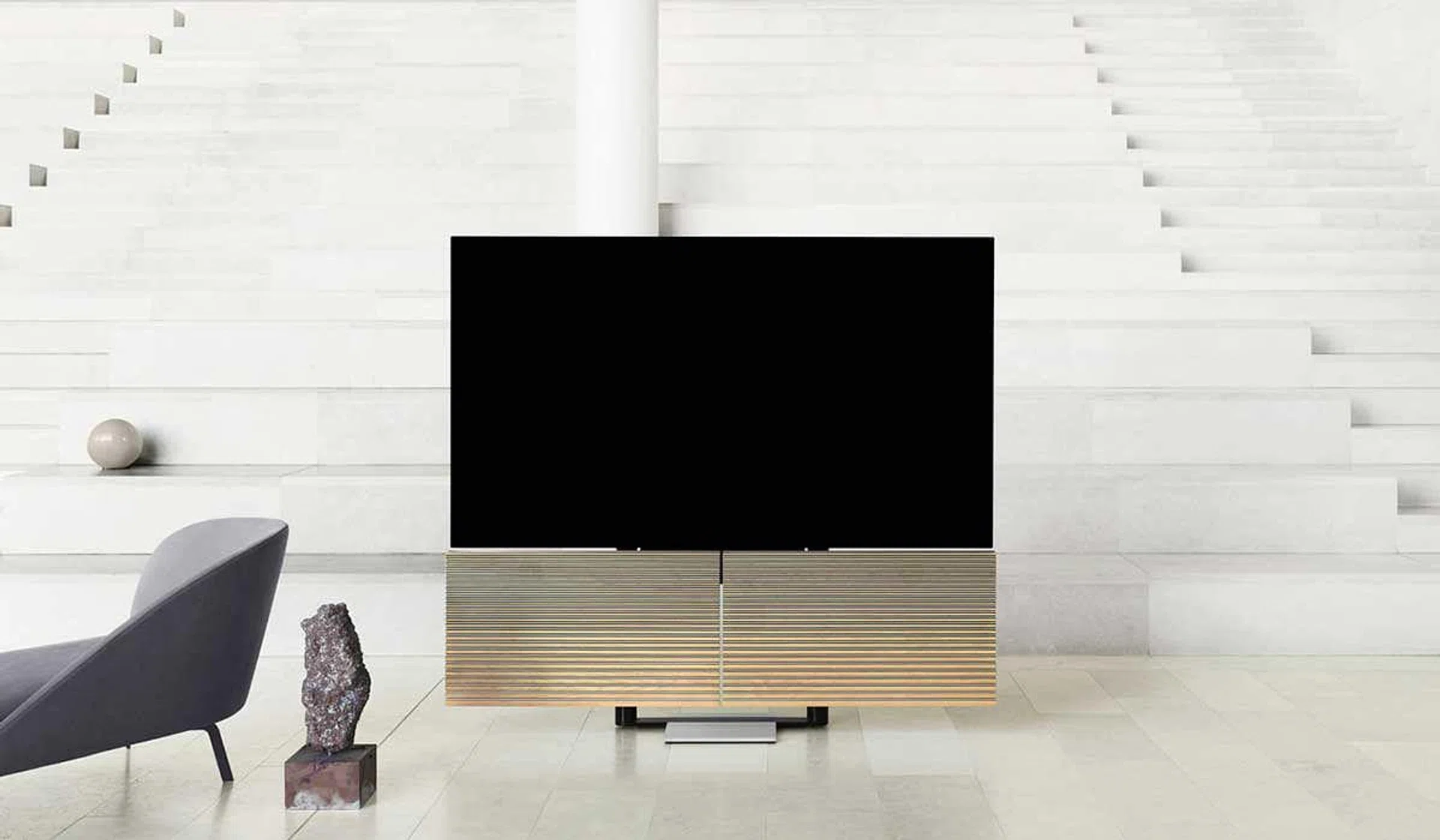 This first piece is for made for the humble abode. Two crafted oak and aluminium fronts conceal a cutting-edge 77-inch OLED screen from LG. When turned on, the fronts fan open like the wings of a butterfly, unveiling the screen that rises to an optimal height for your viewing pleasure. This same mesmerising sequence is played in reverse when turned off.