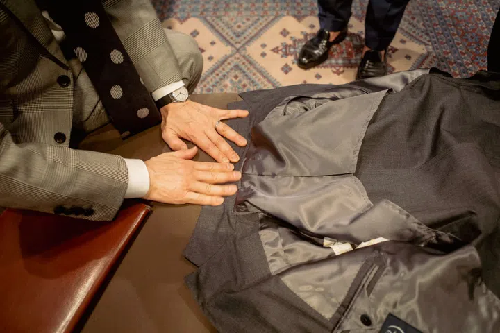 While the experts used a set of sample suits to match a client during the single customisation session, micro-adjustments are nailed down to the millimetre. “We ensure there’s no gaping at the chest and neck nape. We examine how the trousers drape when sitting versus standing, and we address body asymmetry,” stated Nakamura.