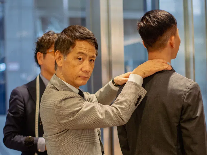 Unlike regular tailors who rely on generic patterns, BEAMS experts assess posture, shoulder and chest slope, hip profile, and whether a client sits or stands more frequently. “There’s a lot of touching of the client’s body to understand his bone structure,” noted Nakamura, who added that’s the reason his all-men team does not serve female clientele.