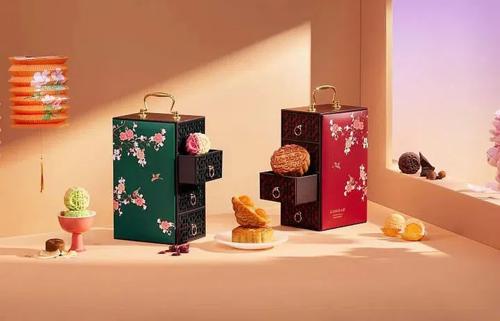 From a latticed facade to a gold handle and little drawers, Conrad Centennial Singapore’s Oriental-style mooncake boxes are ones we’d save for storing knick-knacks (or snacks for the upcoming Lunar New Year).