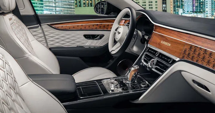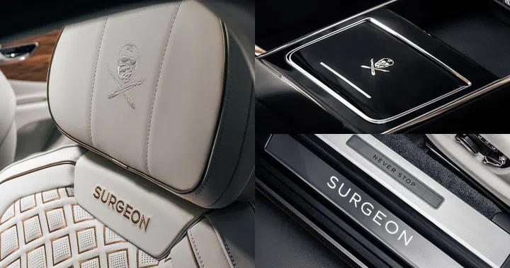 Other classic Surgeon motifs be found throughout the custom-made Flying Spur, particularly in its interior – such as LED puddle lights that project the designer’s skull and crossed scalpel logo onto the ground. The emblem can also be found on the headrest of every seat and the wood veneer covering the dashboard and door panels.