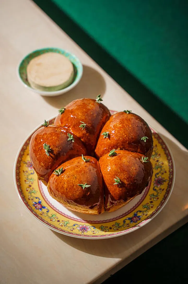 Toeing the line between sweet and savoury, the airy bread rolls are made with American dark rye flour, French butter and yeast. It’s glazed with a vegemite caramel, an ode to Australia where Naleendra spent much of his time and a personal favourite condiment of the chef’s. On the side is more vegemite, this time in French butter whipped with ricotta for an extra punch of umami.
