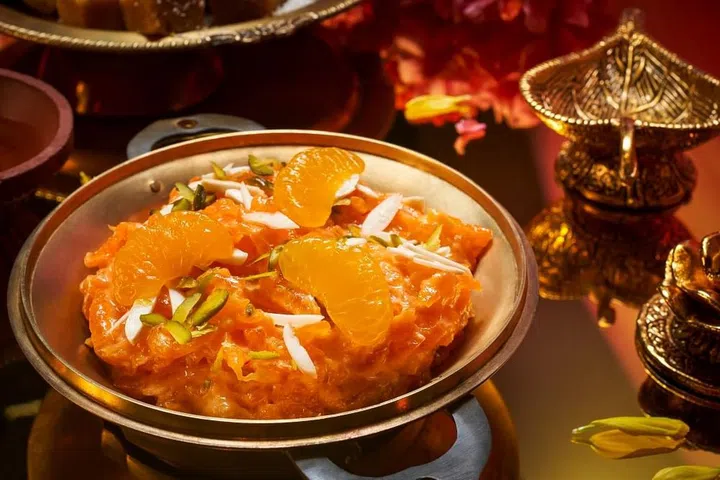 For the vegetarians, opt for the Dal Dhokli, an aromatic stew of yellow lentil, tamarind, jaggery, curry leaves. It is served with chickpea bread to dip in the flavourful broth. Save stomach space for Jodhpuri Vegetable Biryani, basmati rice layered with mixed vegetables, rose water, saffron, fresh mint, and coriander leaves. End the meal on a high with desserts such as Orange Halwa, a sweet made of orange and ash gourd, which is popularly enjoyed in the Northern regions of India. Besan Nariyal Burfi, is another beloved milk-based sweet with chickpea and coconut handcrafted into a melty fudge-like consistency.
