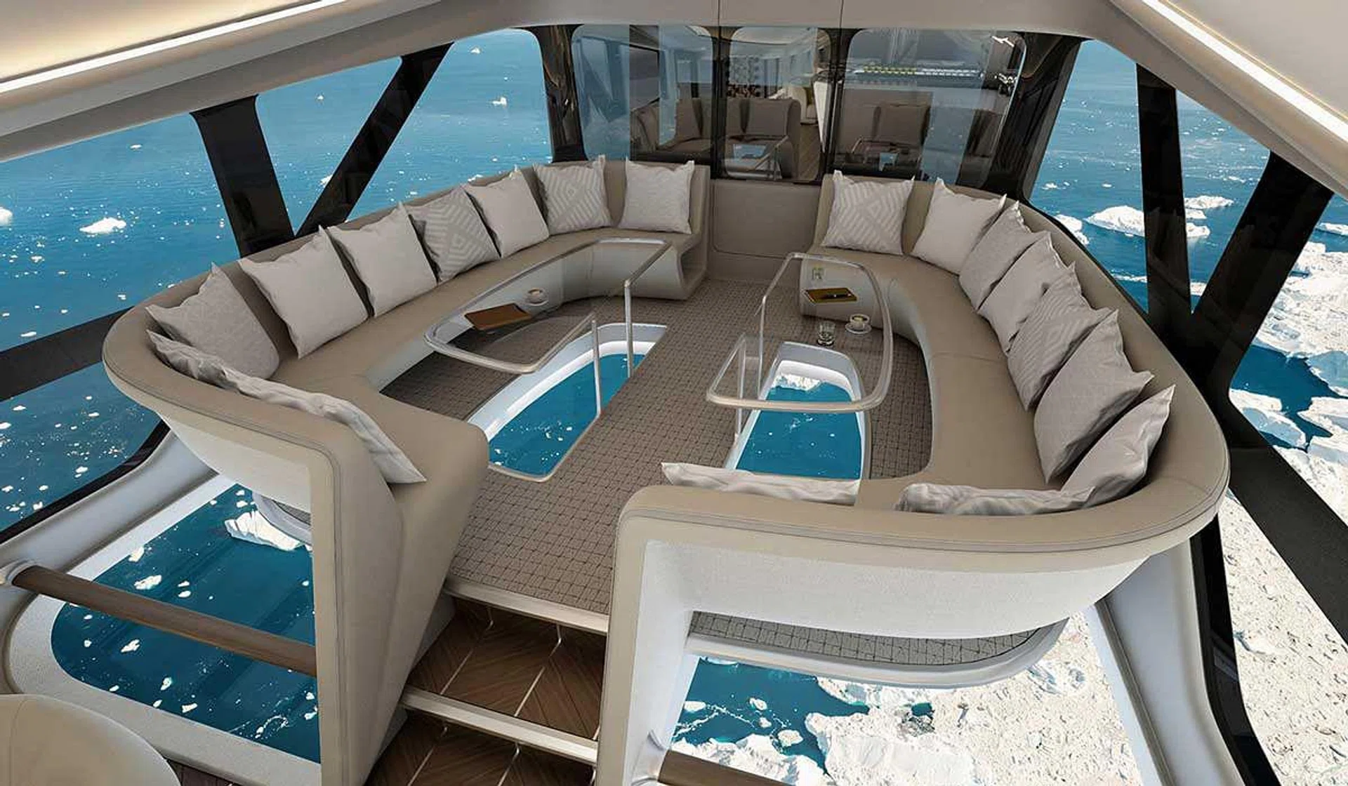 Likewise, ‘floor-to-ceiling' windows stretch along the length of the cabin for sweeping views of sky and clouds.