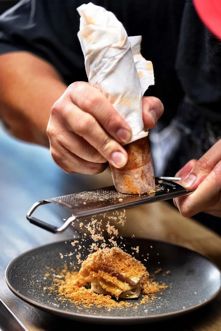 We found altogether up to seven different ways bread appeared in the menu, but there’s one that’ll be more familiar to patrons of Small’s V1 - a fatty slice of aburi engawa (flounder fin) with stir-fried papaya salad on charcoal grilled bread topped with frozen ankimo (monkfish liver) shavings. An item from the earlier menu, it was so well received (no surprise, it was my favourite too) that Shen took it as an affirmation to change the omakase.