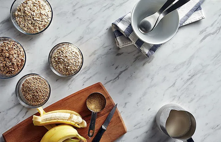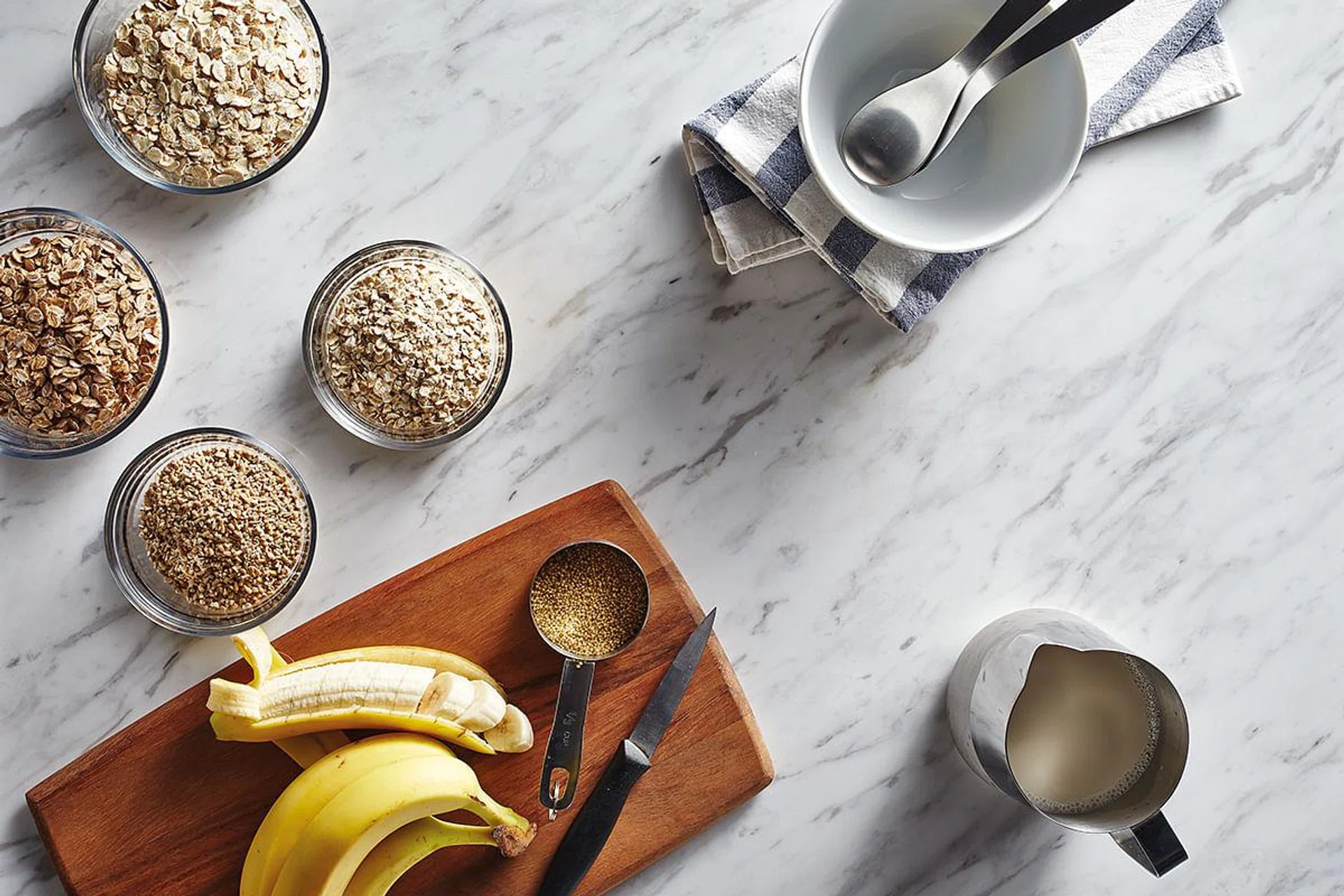 Start with a foundation of flaked wholegrain cereals. Let them stand in liquid overnight until they reach the desired toothsome softness. Add garnish and toppings. That’s it.