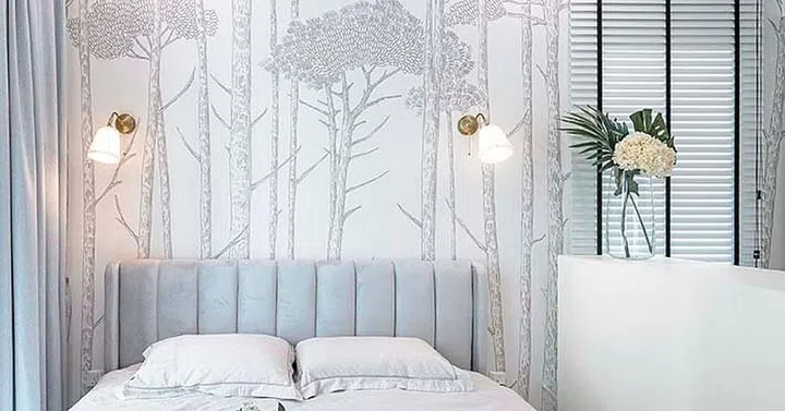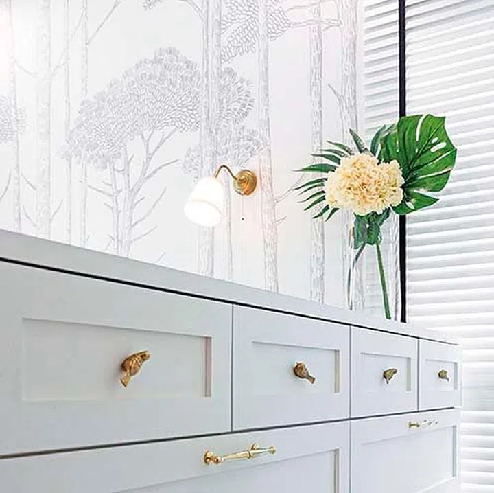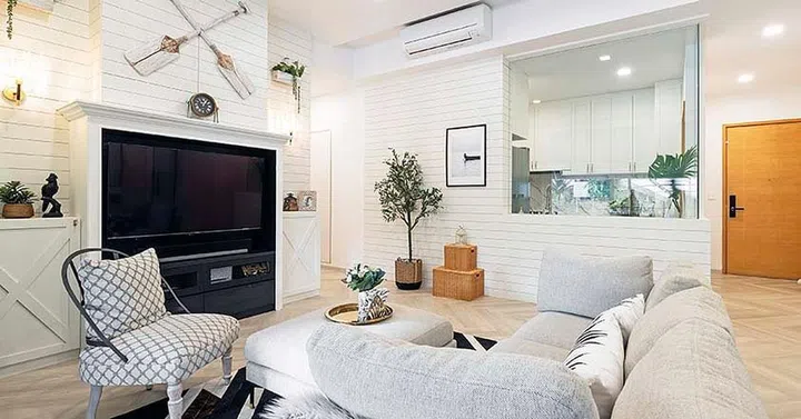 Apart from being Carmen’s maiden attempt at the Hamptons style, this $120,000 project (including furniture) is also her first time working with soft-look wallpaper. In the master bedroom, the monochromatic wallpaper with a nature theme psychologically connects with the outdoor landscape just beyond the balcony. It can also be conceived as an extension of the Hamptons concept that revolves around nature and the outdoors.