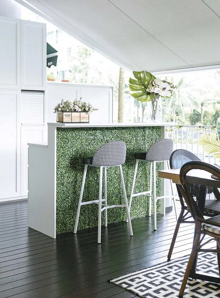 New weather-resistant cabinets have been added to one side of the patio behind the bar counter. The white, shaker-style cabinet doors are synonymous with the Hamptons style because Carmen believes that at the end of the day, whatever the storage solution, they also need to work in the aesthetics department. “Form and function always have to go hand in hand. Always,” she emphasises.