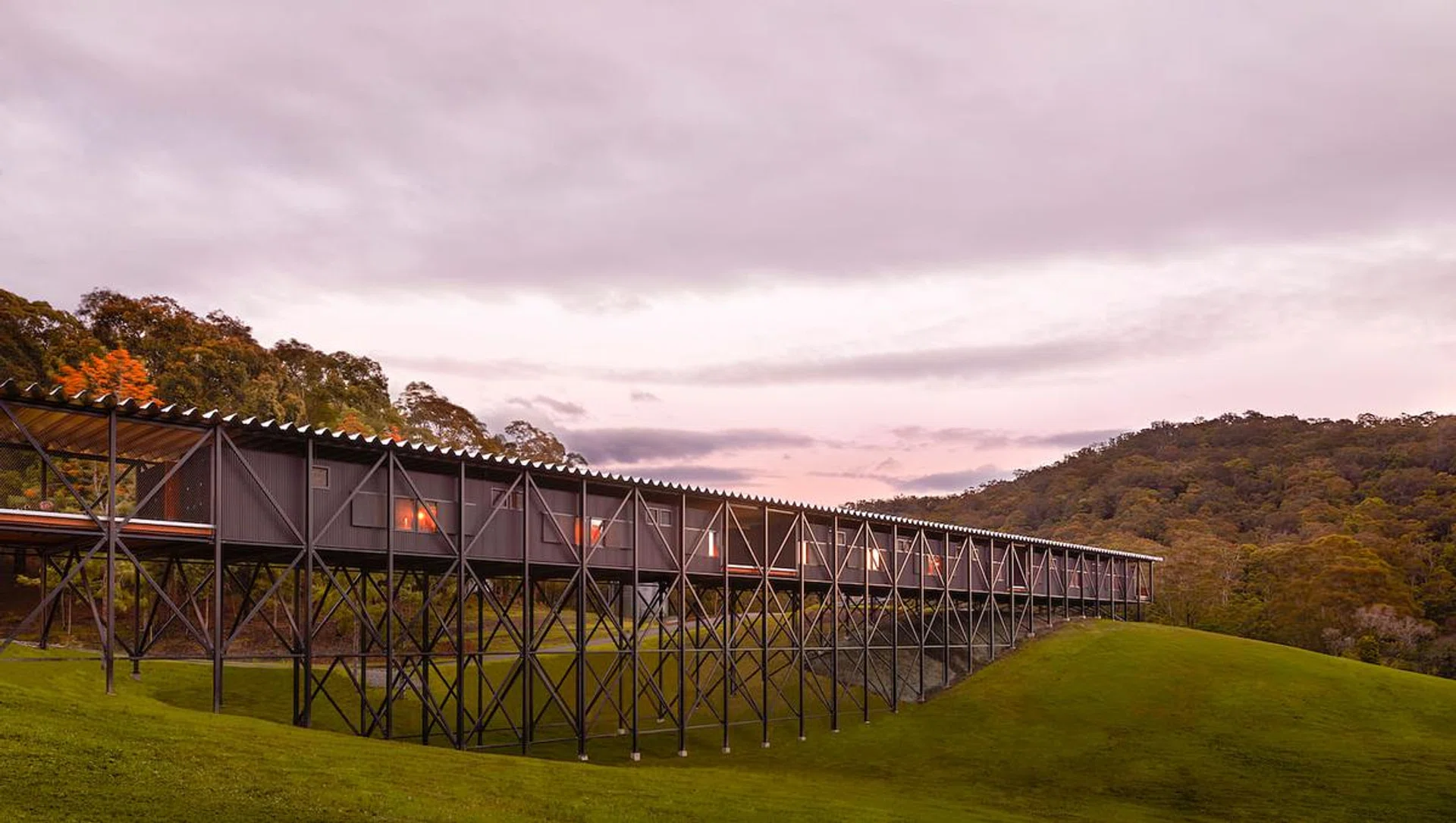 The bridge itself is just as sturdy – built to allow any floodwaters to flow around its supports, thereby keeping the learning centre, accommodations for up to 64 guests and dining facilities within safe (while offering a spectacular view of the Shoalhaven River. It’s also a reflection of the estate’s ambitions for net zero emissions – the bridge combines solar power with passive temperature management, rainwater collection and black water treatment. They’ve also relied on locally-sourced materials during construction, and a commitment towards reduction in use of fossil fuels.