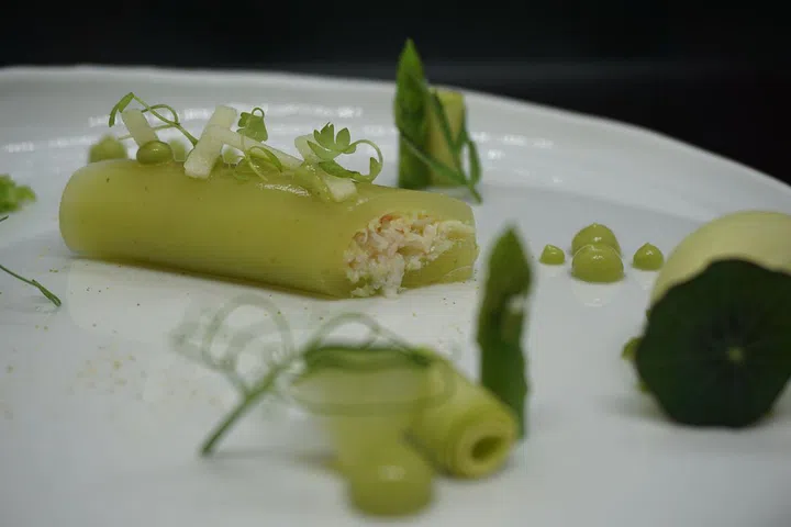 Snails, more commonly eaten in the cooler-climate Italian north, come cooked in a sofrito as a "ragu" (the question here is: are snails meat?) sitting in the bottom of a dainty eggshell cup, covered in vermouth sabayon. There is snow crab, which comes sheathed in green tomato as part of a larger food-assemblage of other green things like pencil asparagus, and cucumber – each manipulated in its own way in a show of fine dining-theatre.