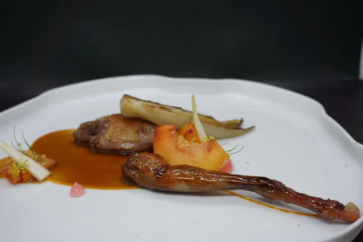 Chargrilled Dry Aged Mieral Pigeon - served two ways, Peaches, Pumpkin, Amaretto and Moscato Sauce