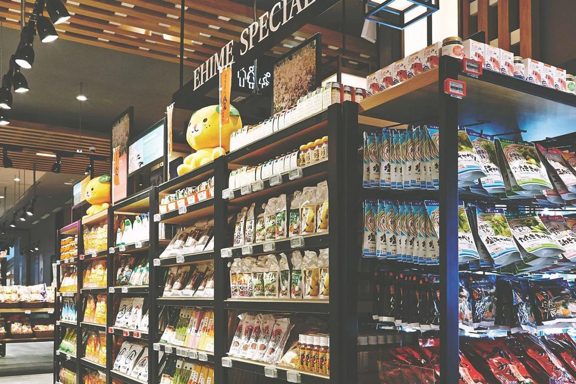 The Ehime Regional Trade Promotion Association has set up its first permanent food showcase outside of Japan at Emporium Shokuhin in Marina Square. The speciality section is tucked between ramen restaurant Burosu Honten and the escalators in the emporium. At any one time, it will have more than 100 products from the prefecture, including seasonal specialities.