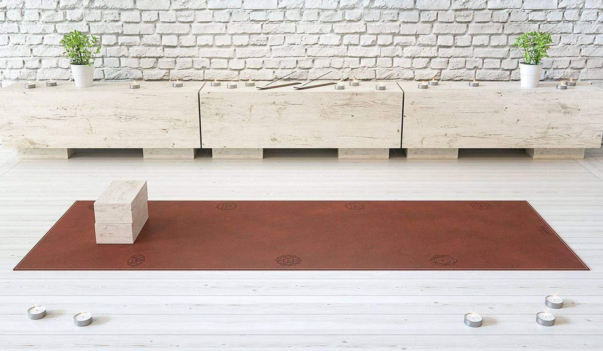 In your search for inner peace, why not adopt a bejewelled leather yoga mat as your equipment of choice? It provides good support, superior grip strength, looks good, and will look even better over time, as it ages — which is why they even come with a lifetime guarantee.