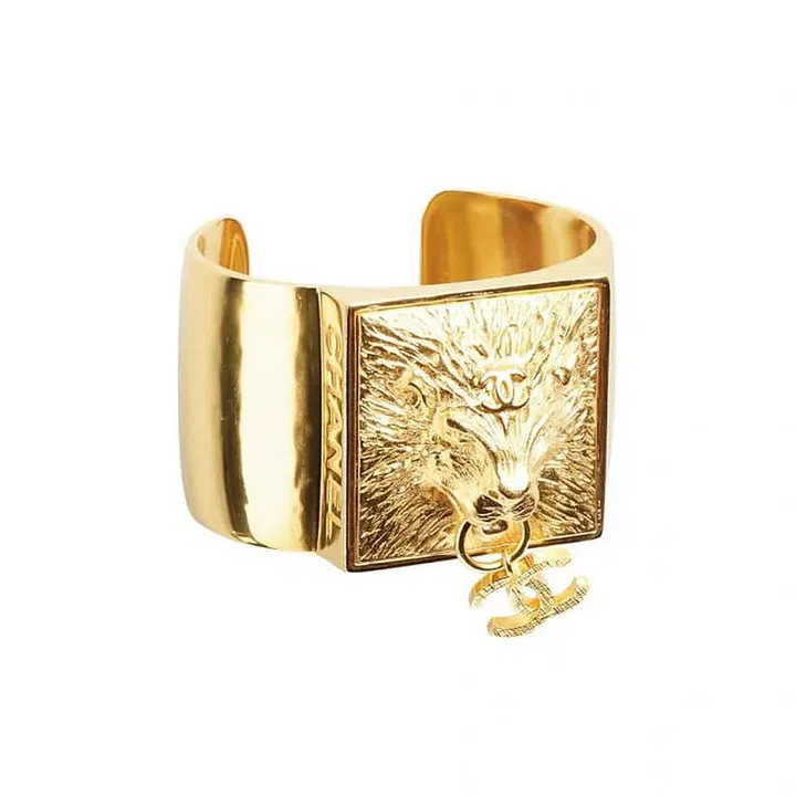 The jewellery house Goossens, which is famed for drawing influences from Ancient Egypt and Byzantium, has been crafting detailed costume jewellery pieces for Chanel since the mid-20th century. Founder Robert Goossens’ baroque style that combined raw elements and juxtaposing materials was what caught the eye of Gabrielle Chanel. The lion face relief on the cuff holds a powerful significance to Mademoiselle Chanel: Not only does it signify her astrological sign (she’s a Leo), it’s also the emblem of her favourite city, Venice. Her love for the animal runs deep; incorporating its imagery into buttons, handbag clasps, costume jewellery and even decorating her 31 rue Cambon apartment with lion figures.