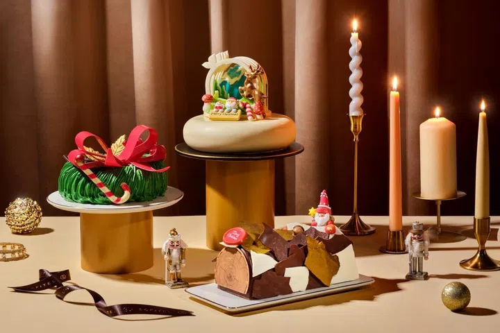 Sofitel Singapore City Centre has come up with some of the season’s most charming cakes. First is the playful Enchanted Forest Log Cake, shaped into a whimsical woodland scene complete with Santa, a snowman, and a reindeer; inside, pandan sponge, gula jawa namelaka, and coconut mousse give it a local touch. The fruity Holly Jolly Festive Wreath Cake is another delightful option, crafted to resemble a holiday wreath and filled with mango-passion mousse, citrus crémeux, and almond dacquoise.