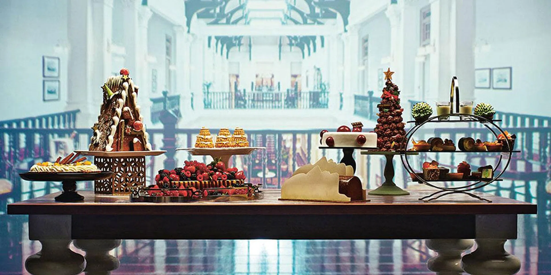 (From left) Spiced Pumpkin Pie, from The Westin Singapore. Christmas Gingerbread House, from Singapore Marriott Hotel. Black glass cake stand and geometric-cage candle cover, from AF Home.“Gluttony” Vanilla Mascarpone Mousse and Passion Fruit Sponge Log Cake topped with fresh berries, from Ritz-Carlton, Millenia Singapore. Mirrored-base tray, from AF Home. Petite Hazelnut Christmas Tree, from Goodwood Park Hotel. White ceramic cake stand, from AF Home. “Pride” Chocolate Mousse, Chocolate Creme and Chocolate Sacher Sponge, from Ritz-Carlton, Millenia Singapore. Little Red Dot cake, from Carousel at Royal Plaza on Scotts. Chocolate Gianduja Ball Christmas Tree, from Antoinette. Imaginary Friends Afternoon Tea featuring Asian-inspired bites like Octopus Mirin Quiche with Bonito Flakes, and Durian Puff with Spiked Meringue, from Pacific Marketplace at Pan Pacific Singapore. Shot on the Gervasoni Gray 34 in natural lacquered American walnut top and white china feet, from XTRA.
