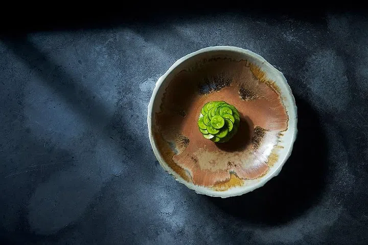 Then there are in-between places. Marron, that Western Australian favourite, is eased into doneness over binchotan while being basted with its own tomalley and butter. This comes with millet cooked in Sri Lankan yellow curry, and puffed millet for texture. It arrives on a bronze plate tessellated with what looks like Islamic geometric patterns — and suddenly you're jolted to another new, strange place.