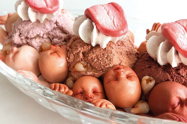 Having started with dead fairies and moved on to sweets and baby heads, she has settled on food as a universally relatable subject. “Everyone has to eat, no matter who they are or where they come from,” she says.