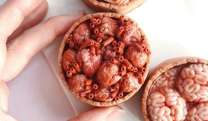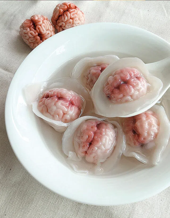 “Food has always been portrayed as desirable and enticing. Turning that familiarity into something strange and surprising has always been central to my work,” she says, of her macabre creations that incorporate miniature polymer clay body parts — hearts, brains, teeth, tongues — into everyday sweet wrappers, sardine cans, even dim sum and sushi.