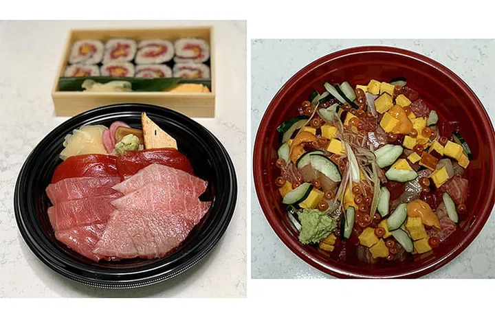 (Left) Sushi Kimura’s entire takeaway menu revolves around different cuts of tuna. (Right) At Aoki, its Maze chirashi is the star item on its limited takeaway menu.