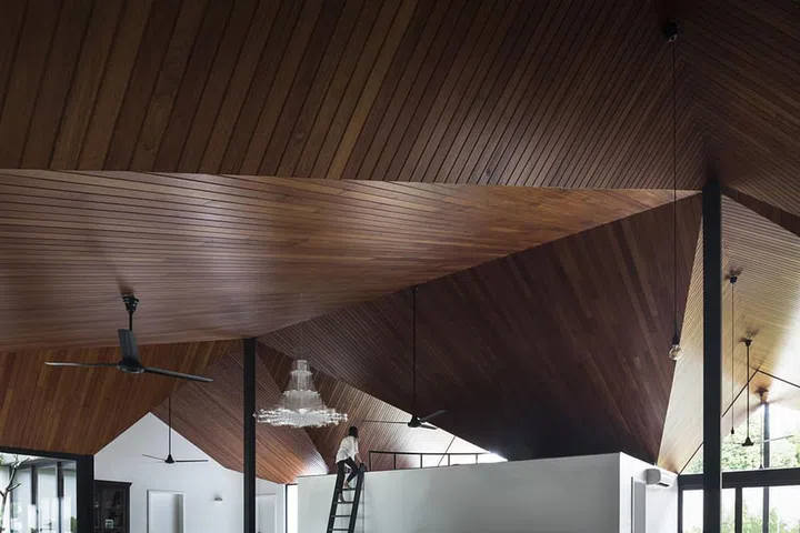 Internally, the reverse pitched roofs have created an undulating ceiling, which never fails to be a talking point. To give warmth to the home, the multi-faceted ceiling is made out of strips of chengal wood, which were assembled piece by piece by a craftsman who took 14 months to complete the job.