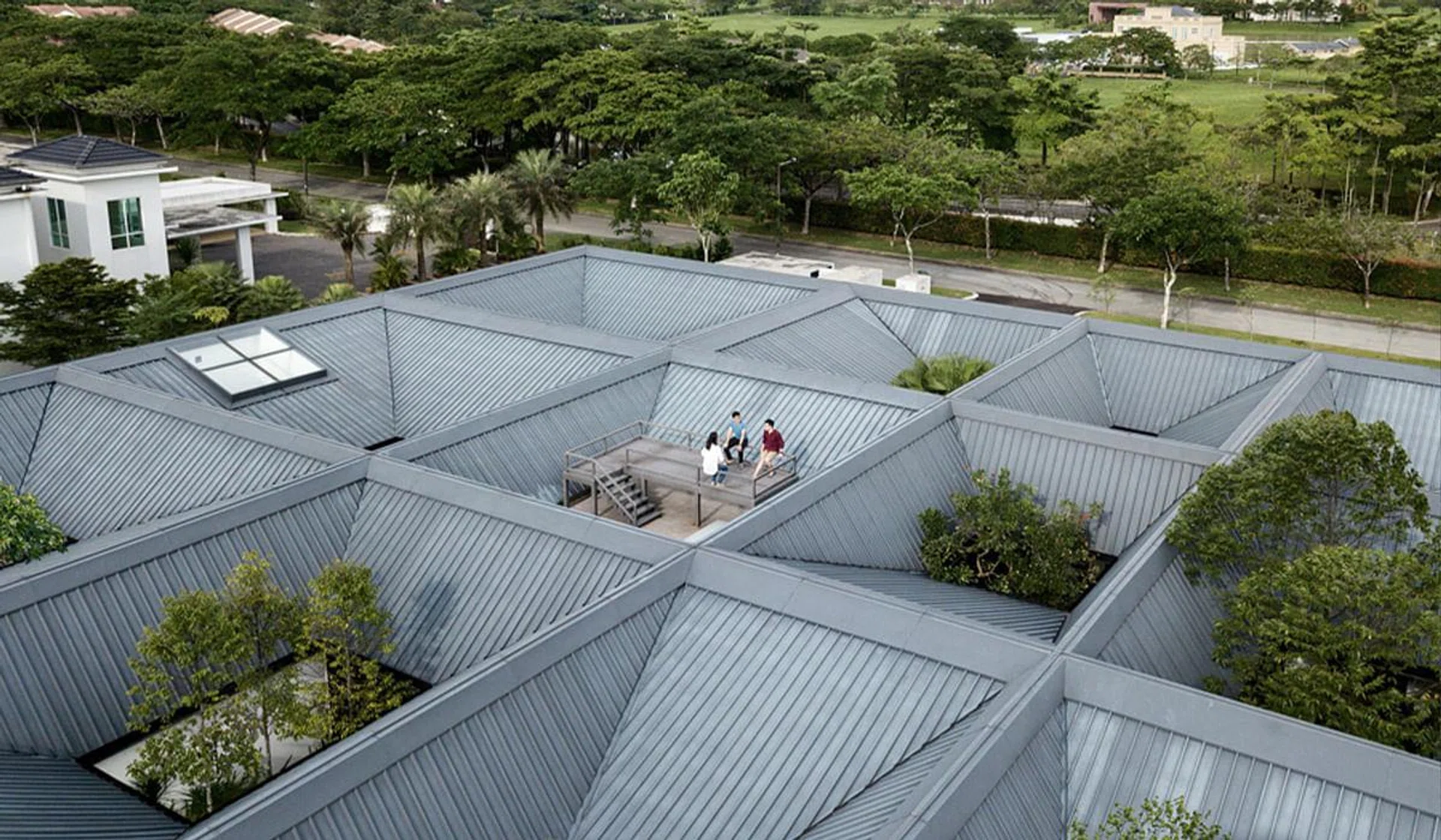 They had initially designed for the house to have conventional pitched roofs, but Kum Loon had the bright idea to flip the roof upside down, creating a series of funnel-like roofs, which are best seen from above.