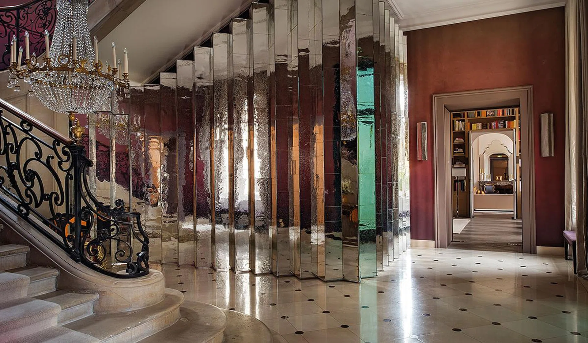 “For me, working with light is the key to everything. I wanted to use high ceilings and column pillars to play with space and the light. Different materials and decor provide the finishing touches,” says Moinard. The designer also painted a kaleidoscope of coloured diamonds with the idea that the stones reflected light in a variety of different ways through angles, forms and symmetries.